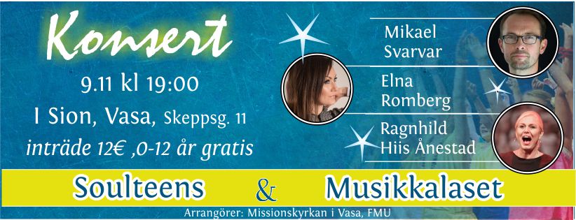 Lördagen den 9 november kl.19.00 ordnas en konsert i Sion i Vasa. På konserten uppträder barn- och ungdomskörer tillsammans med Mikael Svarvar och Elna Romberg.